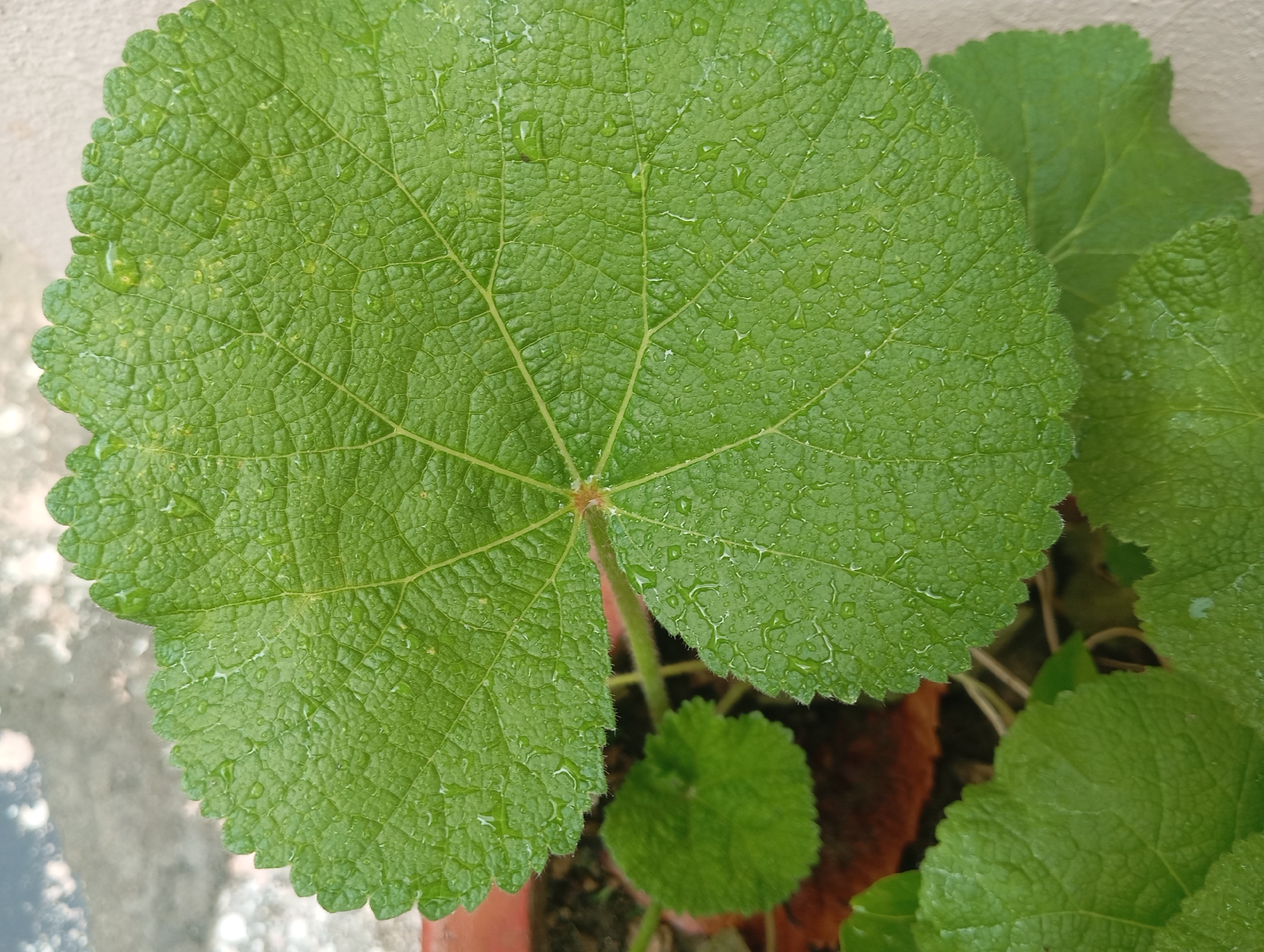 close-up view of a plant with large, round, green leaves with serrated edges and prominent veins. Water droplets are visible on the leaf surfaces. The plant is growing in a pot. The background is blurred, but parts of a wall and ground are visible. The location and specific details about the city of Lassan, Pakistan, cannot be determined from the image.
