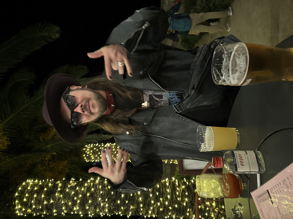 The image depicts an outdoor nighttime scene at a bar or restaurant in Rafailovići, Montenegro. A person with long brown hair, a beard, and wearing a dark wide-brimmed hat, black cat-eye sunglasses, a black leather jacket, a red spiked collar, and a black fanny pack is seated at a dark round table, facing the camera. Both hands are raised, with the left hand exhibiting a ring on the middle finger and a white band on the index finger, while the right hand displays a silver ring on the ring finger and a "rock on" gesture. Fingernails are painted dark. On the table are three beverages: a tall glass with a reddish-brown liquid and ice, a medium-sized glass with a yellow foamy drink (likely beer), and a tall glass with a lighter amber foamy drink (also beer, with "Guinness" faintly visible). A small, clear glass bottle with a red cap, labeled "DIVNA ŠLJIVOVICA BARRIQUE 00801," is positioned between the first two glasses. A light-colored menu or document is partially visible on the far left of the table, next to a small, glowing golden object. In the background, two palm trees are heavily wrapped with warm white string lights. Further back on the right, a second person is visible from behind, wearing a light-colored jacket, beige pants, and a blue backpack, standing on what appears to be a pathway or lower ground.