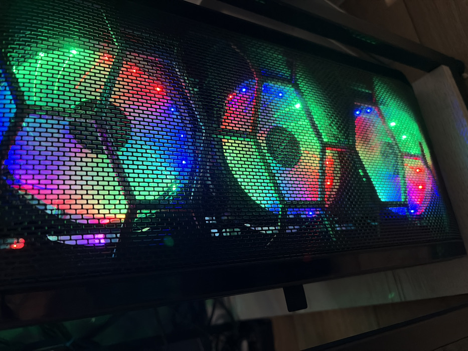 This image depicts the front, upper-right portion of a black desktop computer tower, situated indoors in Rostov-on-Don, Russia. The computer case features a black mesh grille, behind which three vertically aligned circular fans with multi-colored RGB illumination are visible. The fans emit light in shades of red, green, blue, purple, and cyan, creating a dynamic, glowing effect through the mesh. The background is dark and out of focus, with a light-colored surface (possibly flooring or a shelf) and a dark vertical support structure visible on the right side of the frame. No individuals or active interactions are depicted.