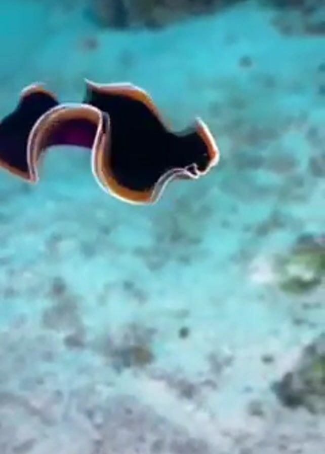flatworm swimming in clear turquoise water. The flatworm is black with a thin orange border and a burgundy underside. The seafloor is visible in the background.