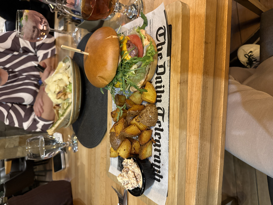 The image displays a dining scene inside a restaurant in Razlog, Bulgaria. The central focus is a meal served on a rectangular wooden board, which is underlaid with a sheet of paper resembling a newspaper, partially showing "The Daily Telegraph" masthead. The meal includes a cheeseburger with a brioche bun, beef patty, melted yellow cheese, sliced red tomato, green lettuce, and arugula, held together by a small wooden skewer. Alongside are numerous roasted potato wedges with visible skins and seasoning, and a small black ramekin containing a creamy, light-colored side dish. On the light-colored wooden table, to the right of the meal, a stemmed glass holds an amber-colored beverage. Further back, a clear stemmed glass filled with water is visible, next to a second stemmed glass containing a pink beverage garnished with a mint sprig and a citrus wedge. A dark, circular placemat is situated beneath a bowl of salad, which features lettuce and a substantial amount of shredded or shaved white cheese. Across the table, a person wearing a brown and white patterned long-sleeved shirt is seated, with their hands resting on the table near a dark object. The background reveals a restaurant interior with dark, upholstered chairs, a textured wall, and blurred elements of other tables and patrons. In the lower foreground, a partial view of a person's lap dressed in light-colored clothing and a white shoe is visible under the table.