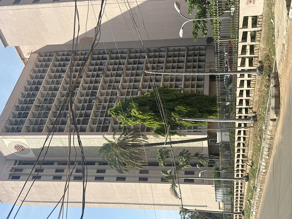 - "A tall, beige building with a grid-like facade dominates the frame, its many square windows catching the sunlight" by FM-NXgDj2, licensed under CC BY 4.0