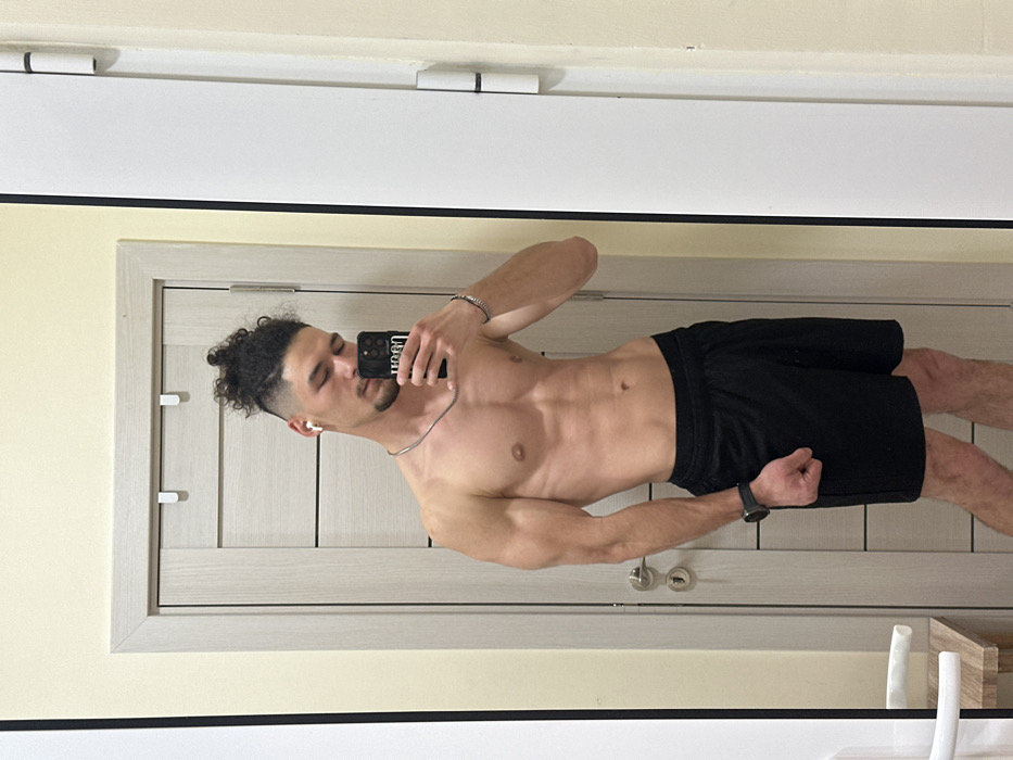 An image depicts a male individual taking a mirror selfie indoors. The subject is shirtless, showcasing a muscular physique with visible abdominal definition. He has dark, curly hair styled in a bun with faded sides, and light facial hair. He is wearing black athletic shorts, a silver chain necklace, a silver chain bracelet on his right wrist, a dark-colored smartwatch on his left wrist, and a white earbud in his left ear. He holds a dark-colored smartphone in his right hand, angled towards the mirror, with the phone case displaying inverted white lettering. His eyes are downcast or closed, and his head is slightly tilted. The background, reflected in the mirror, consists of a light-colored wooden door with horizontal panels, featuring a silver handle and keyhole. Two white hooks are mounted on the door frame above the handle. To the left, a plain, light-colored wall is visible, along with a partial view of a white vertical frame and a small wooden shelf holding a white object. The setting is a private interior in Varna, Bulgaria.