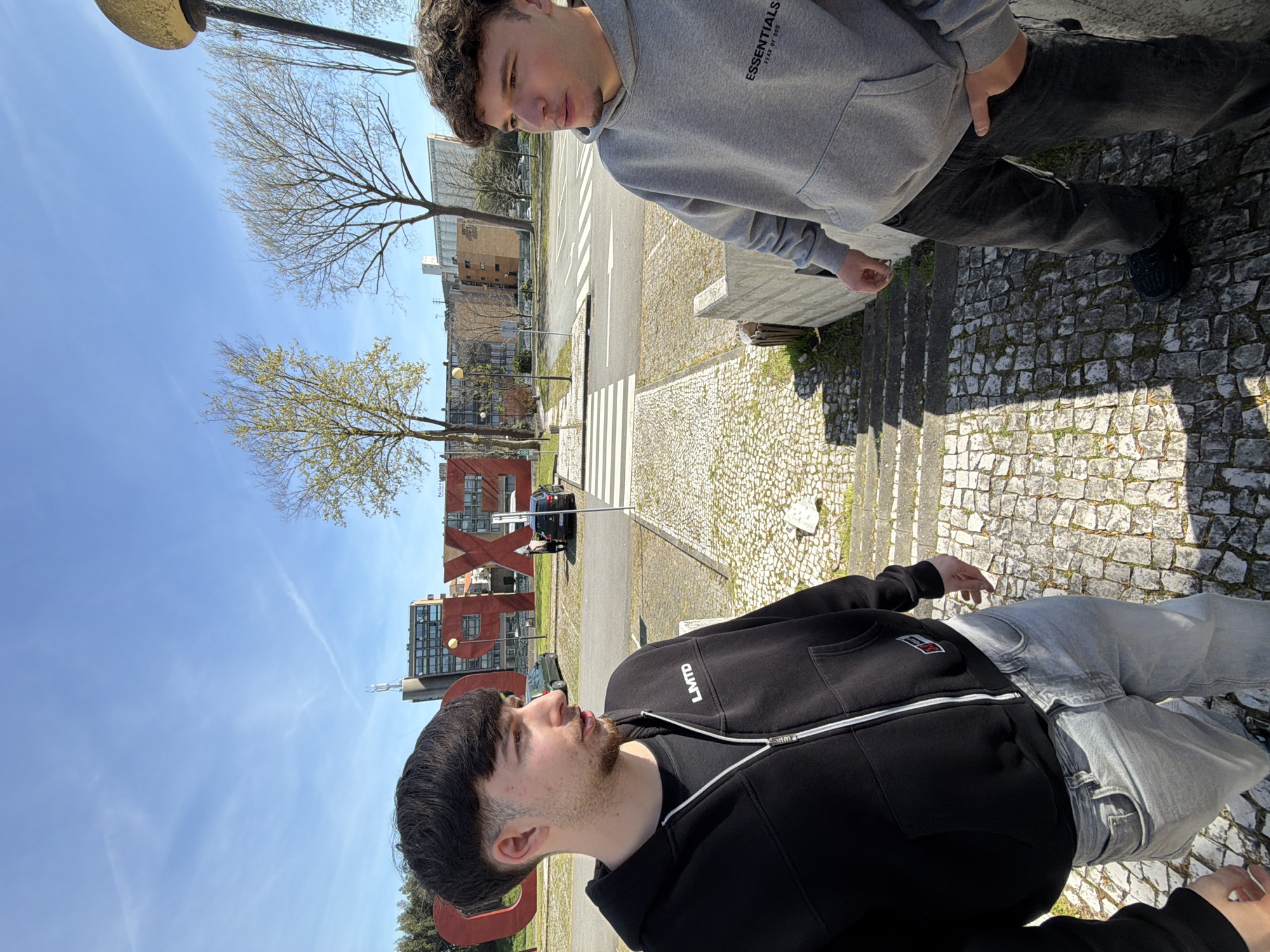 The image captures two young adult males on a cobblestone pathway and steps within an urban setting in Matosinhos, Portugal, identifiable by the large red "PORTO" letters in the background at Parque Basílio Teles. The subject on the left, closer to the viewer, is a male with dark hair styled with a fade, and light facial stubble. He wears a black, zippered hoodie with a white zipper and "LMTD" text on the left chest, paired with light-wash blue jeans. He stands on the cobblestone pathway, facing slightly right with his mouth partially open. The subject on the right, positioned lower on concrete steps that transition into the cobblestone, is a male with curly brown hair and light facial stubble. He wears a grey hooded sweatshirt featuring "ESSENTIALS FEAR OF GOD" branding on the left chest, and dark-wash jeans. His right hand is inserted into his front pocket. He faces slightly left with his mouth partially open. In the background, behind the subjects, a street with a prominent white crosswalk and a white directional arrow is visible. A dark sedan is parked on the street near the large red letters, which spell "PORTO" in the midground. Beyond the street and letters, various multi-story urban buildings are present, along with several bare or sparsely leafed deciduous trees. The sky is clear blue with sparse cirrus clouds, and the scene is illuminated by strong sunlight, casting defined shadows.