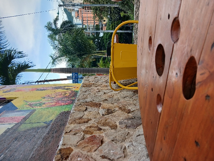 A low-angle shot captures a vivid scene. A colorful mural adorns a wall, adjacent to a rustic stone barrier. A yellow children's wagon sits prominently, partly obscured by a large, wooden spool with circular openings. In the backdrop, lush palm trees and urban buildings fade into a bright sky. The perspective emphasizes textures and the juxtaposition of art, nature, and urban elements.