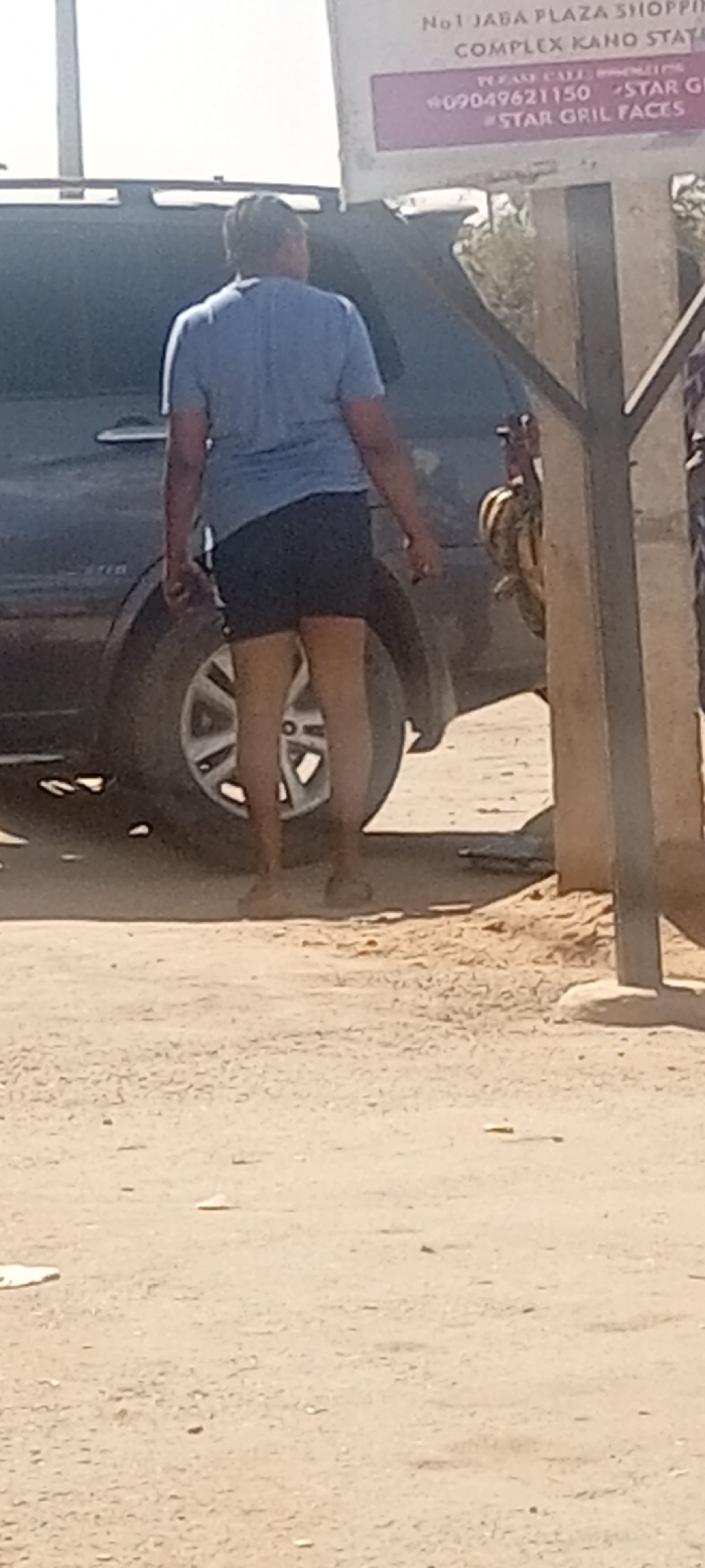 The image depicts an outdoor scene in Kwachiri, Kano State, Nigeria, specifically near No 1 Jaba Plaza Shopping Complex. An individual, observed from behind, stands facing right, wearing a light blue short-sleeved top and dark shorts. Their feet appear bare or minimally shod. Behind this individual, a dark-colored SUV is parked, with its rear wheel and side visible. To the right of the individual, a rectangular sign is mounted on a support structure. The sign is white with a red/pink band at the bottom, displaying text including "No 1 JABA PLAZA SHOPPING COMPLEX KANO STATE", "PLEASE CALL", "09049621150", "STAR GRIL", and "STAR GRIL FACES". Adjacent to the sign's support pole and near the SUV, a cluster of yellow items, possibly bananas, is visible. The ground is unpaved, consisting of dry, light-colored sand or dirt. The scene is brightly lit under sunny conditions, casting distinct shadows.