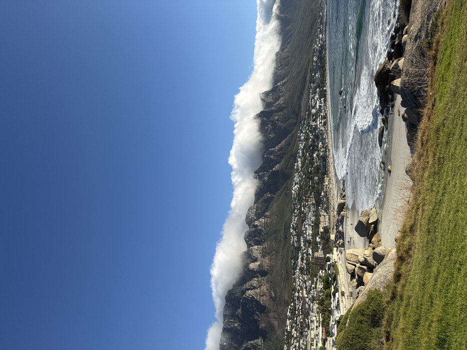 A coastal view features a dramatic mountain range shrouded in a thick blanket of low-lying clouds, bisecting the frame. Below, a densely populated town lines the sandy beach, meeting the ocean's edge where waves crash. Boulders dot the shoreline and a grassy hill borders the right side, offering a natural contrast to the urban and natural elements. The vast, clear blue sky dominates the left side, completing the scene.