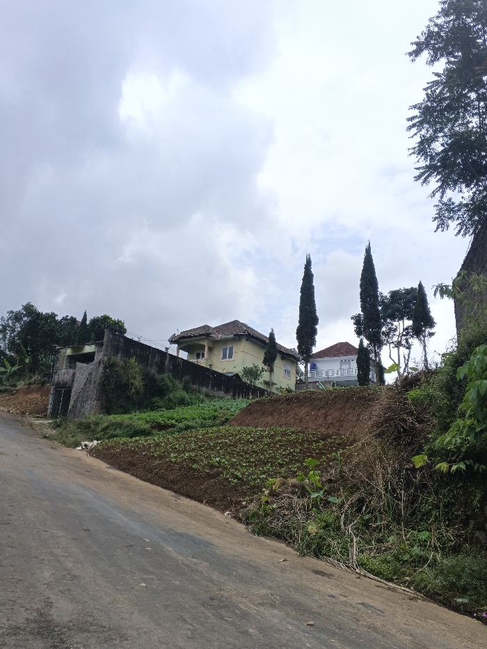 A hillside landscape features two residences. One is light green with a dark tiled roof, partially obscured by a long concrete wall topped with fencing. The other, a white house with a red tiled roof, sits further back. Both are framed by slender, dark green trees. Below, a cultivated field slopes upwards, and a paved road runs in the foreground. Lush vegetation fills the right side of the image. The sky is overcast and cloudy.