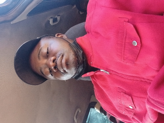 A person wearing a black cap and a black face mask sits inside a vehicle with tan interior. They're wearing a red corduroy jacket with buttoned flap pockets. The person is angled towards the camera, with the car roof and other interior elements visible in the background. The lighting suggests daytime, with some glare on the car's interior surfaces.