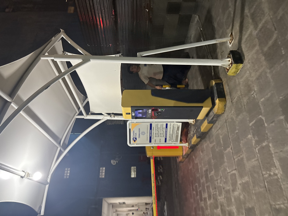 The image depicts an illuminated outdoor parking entrance/exit at night, identified as "Centre Park SUNCITY RESIDENCE" in Sidoarjo, Indonesia. The scene is covered by a white canopy structure supported by white metal framework, with an exposed light bulb providing overhead illumination. The ground consists of grey interlocking pavers. A yellow and black striped parking barrier arm, displaying "SELAMAT DATANG WELCOME" and integrated red indicator lights, is in the horizontal (closed) position. Adjacent to the barrier's pivot mechanism is a yellow cylindrical bollard. A white informational sign, affixed to a pole, details "Centre Park SUNCITY RESIDENCE" parking rates and instructions in Indonesian. A tall, yellow and black automated parking payment machine, featuring a screen, card reader, and various slots, stands nearby. The base of the parking equipment is delineated by yellow and black striped concrete curbs. In the background, to the right, a corrugated metal wall is visible, while to the left, a dark building with multiple small rectangular windows stands. One adult male is present, partially obscured by the automated parking machine and a white support pole. He wears a light-colored short-sleeved t-shirt and dark, loose-fitting lower garments. His right hand holds a yellow tubular object, which appears to be a component or tool related to the barrier system. He is positioned facing the barrier, suggesting an interaction or observation of the parking equipment.