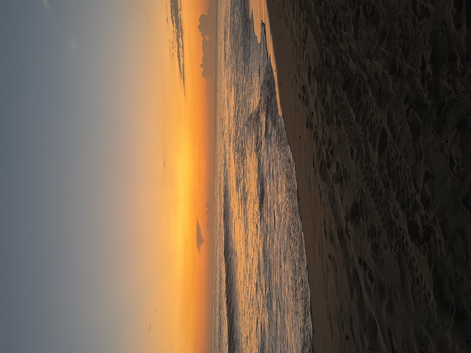 A tranquil beach scene at sunrise or sunset features a gradient sky transitioning from a soft blue to a vibrant orange. The ocean, reflecting the sky's golden hues, meets a sandy beach. The sand near the water is smooth and light, gradually darkening with footprints further inland. The scene exudes peace and serenity, capturing the natural beauty of the coast.
