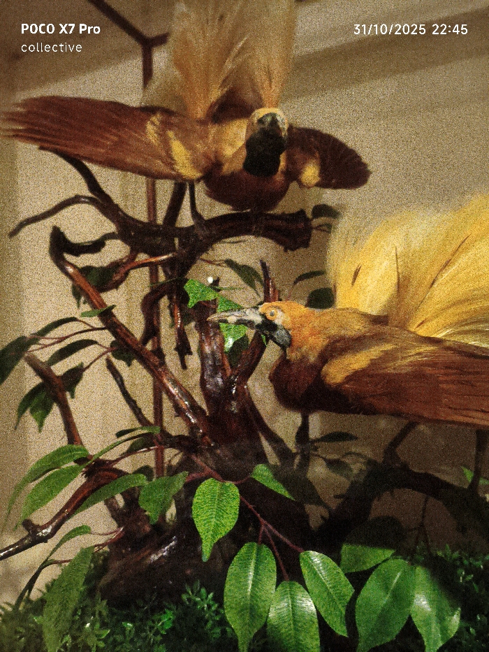 - "The image depicts a static diorama featuring two taxidermied birds, consistent with species from the Paradisaeidae family, arranged on artificial branches and foliage" by FM-hqppR2, licensed under CC BY 4.0