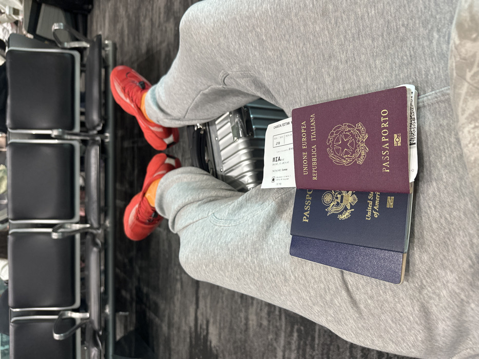A person sits in a grey tracksuit with red sneakers. A small silver suitcase sits between their legs. An Italian passport and a US passport rest on their lap, along with a boarding pass. The airport waiting area is visible, featuring rows of black chairs and grey flooring. The person's casual attire and travel documents suggest they are waiting for a flight.