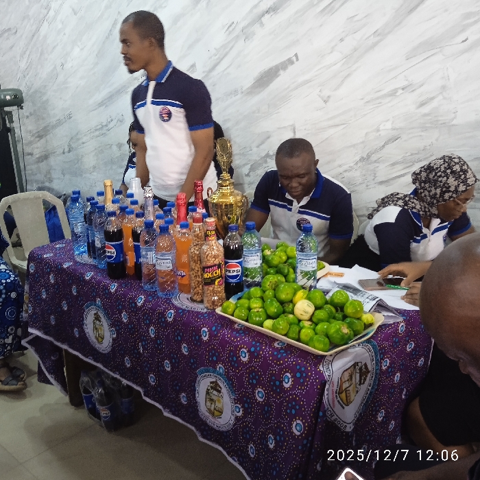 This image depicts an indoor scene in Satellite Town, Nigeria, dated December 7, 2025, at 12:06. The central focus is a long table covered with a purple, patterned tablecloth featuring a circular emblem. Arranged on the table are numerous bottled items: plastic bottles of water (e.g., Nestle Pure Life), various soft drinks (e.g., Pepsi, Fanta), and other beverages, including some containing peanuts. A golden trophy stands prominently behind the bottles. To the right, a tray holds a collection of small, round, green and pale-yellow fruits, consistent with garden eggs. Four individuals are visible. A light-skinned male, wearing a white polo shirt with navy blue sleeves and collar, stands to the left, looking right. Seated behind the table are a dark-skinned male and a dark-skinned female, both dressed in matching white and navy blue polo shirts. The female wears a patterned head covering. Both are looking down at papers and a mobile phone on the table. In the extreme foreground on the right, a bald head of another individual is partially visible, also looking down. The background features a light-colored wall with a subtle marble texture. Additional bottled beverages are visible beneath the table.