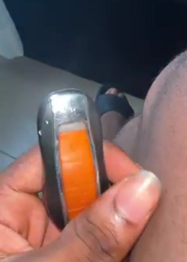 A dark-skinned person sitting down, wearing black slides, holds a car key with three orange buttons. The key has a silver top and black bottom. The person presses a button on the key. The background is blurred, but a black bed and a white floor are visible.