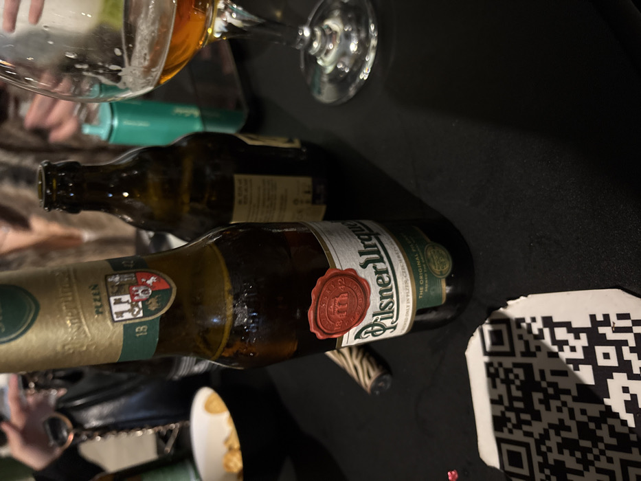 A table view showcases several items. A full bottle of Pilsner Urquell beer lies horizontally, its label and red seal prominent. Behind it, an empty brown beer bottle is visible. A partially filled beer glass and a teal water bottle are present towards the top. A QR code card and a small dish with crumbs are at the bottom edge, near a black purse. The table surface is a dark, matte color.