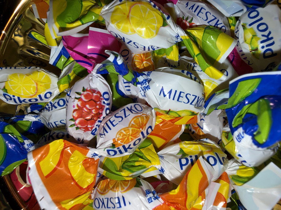 A close-up shot showcases a vibrant assortment of wrapped candies, seemingly overflowing from a container. The candies are individually wrapped in colorful foil, adorned with images of various fruits like lemons, oranges, and raspberries. Text like "MIESZKO" and "Pikolo" is visible on several wrappers, suggesting a brand or flavor designation. The overall composition is a visual explosion of color and suggests a sweet treat.