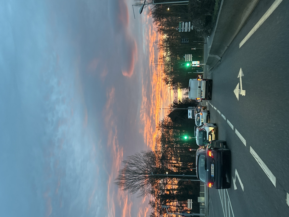 A street view shows several vehicles stopped at a traffic light, illuminated green. The sky above displays a mix of blue and pink hues, potentially at dusk or dawn. A road with white directional arrows is visible. Trees line the road, and streetlights are present along the side. The focus appears to be on the scenic sky and the stopped traffic.