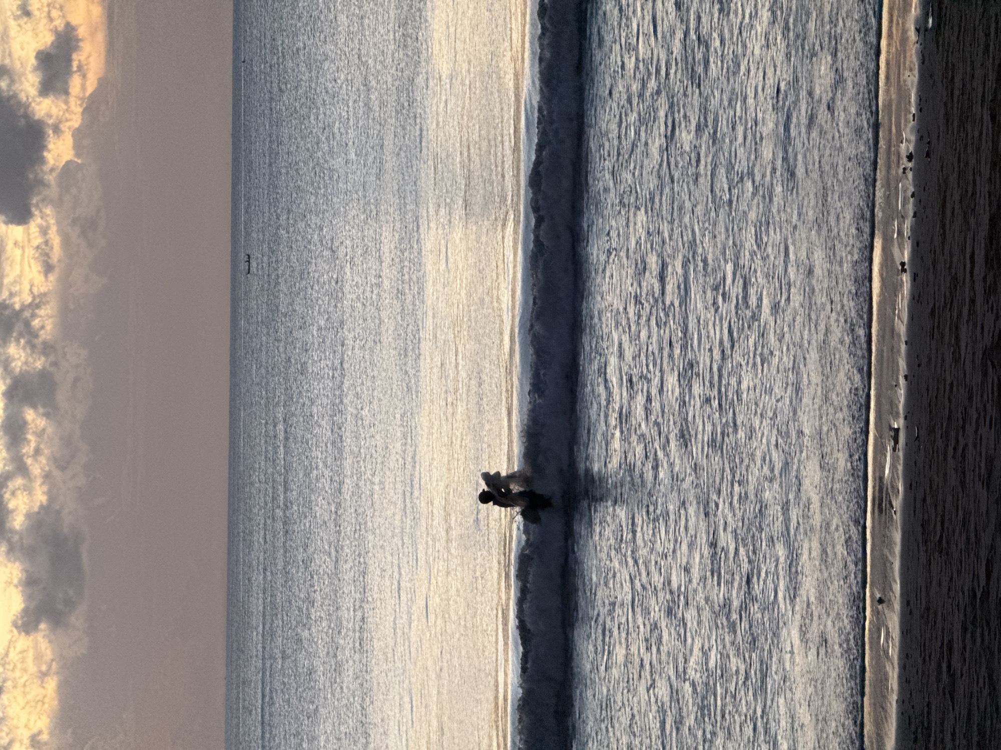 The image depicts a beach scene in Jimbaran, Indonesia. Two people, silhouetted against the bright water, are standing in the surf, interacting near the shoreline. The scene includes a calm ocean, a sandy beach, and a cloudy sky. The water is sparkling with sunlight, and the beach is lightly shaded.