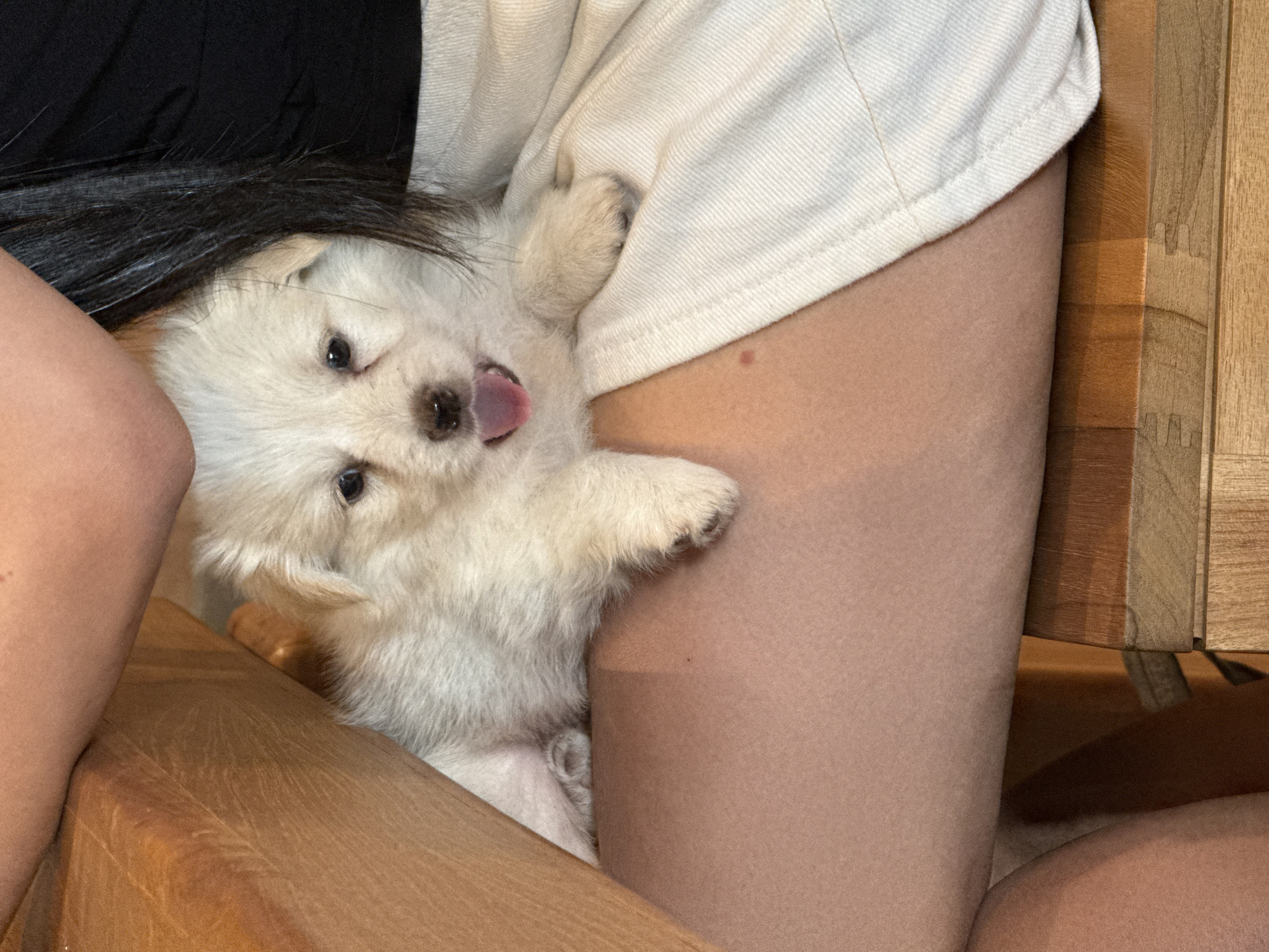 A close-up shot shows a small, light-colored puppy with its tongue sticking out, nestled between a person's legs and the arm of a wooden chair