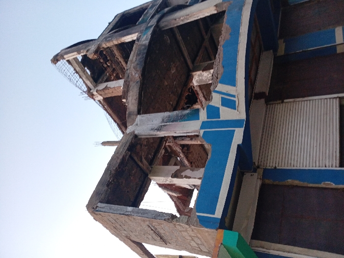 A dilapidated building stands against a clear sky, its structure exposed and crumbling. Reinforced concrete beams frame open spaces, revealing inner walls and ceilings. Blue and white painted accents decorate some of the exterior, contrasting with the decay. Wire mesh and exposed rebar suggest structural reinforcement attempts or remnants of demolition. Parts of the building appear to be relatively intact.