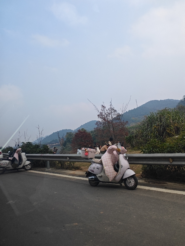 Two parked mopeds sit on a paved road, separated by a silver guardrail. The moped closer to the camera is pale lavender with a pink and white checked blanket draped over its seat. Behind the guardrail, a group of people are gathered, and lush green vegetation covers the hillside. The sky is a pale blue.