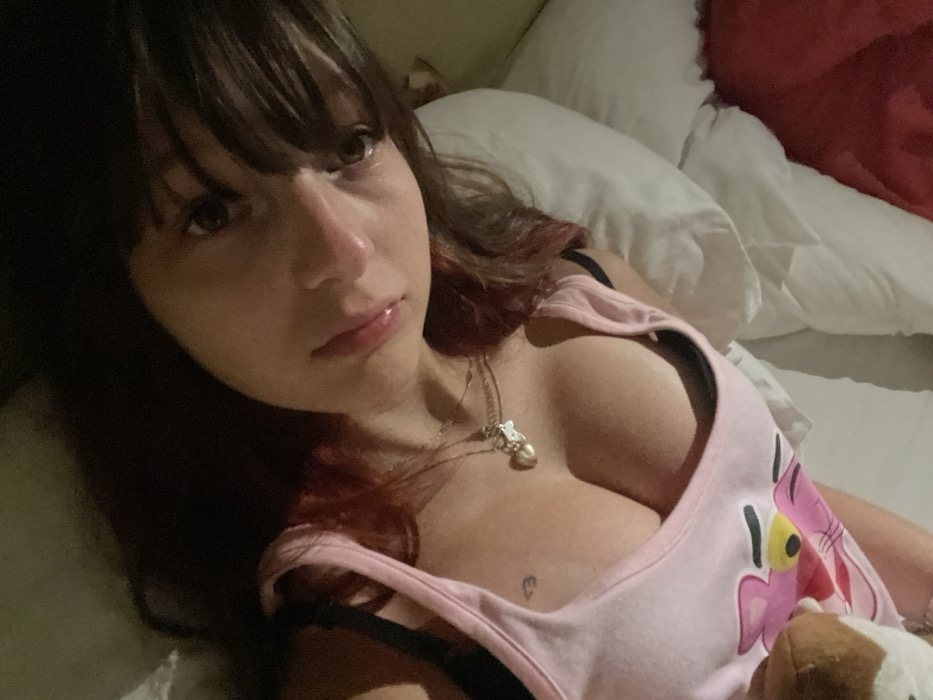A female individual with dark brown hair, styled with bangs, is depicted in a close-up, angled shot, likely a selfie. She is wearing a light pink tank top with a partial graphic of the Pink Panther character visible on the lower left. A black bra is visible beneath the tank top. She has two layered necklaces, with a gold-colored heart-shaped pendant prominent on the lower chain. A small, light-colored heart tattoo is visible on her upper left chest. Her lips appear glossy, and she looks directly at the camera with a slight, neutral expression. She is semi-reclined against a white pillow, with red bedding visible to the right of the frame. A portion of a light-colored plush toy is visible on the lower left. The environment appears to be indoors, under dim lighting, consistent with a bedroom setting. The specific location within Ndlambe Local Municipality, South Africa, cannot be determined from the visual information in the image.
