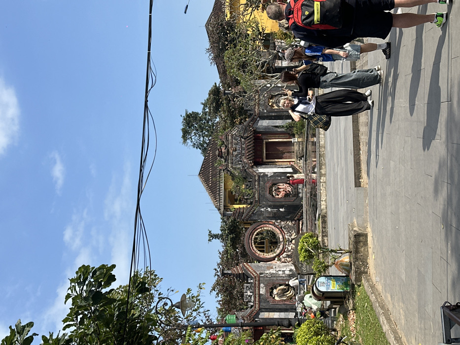 An old building in Vietnam is captured from a ground-level perspective, showcasing its intricate, weathered façade. A circular design is a prominent feature. Utility poles and wires extend towards the sky on the left. People are walking along a paved walkway in front of the building. Lush greenery flanks the structure at the bottom. The sky is blue with light clouds.