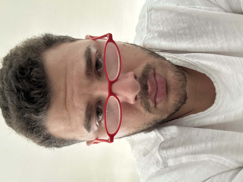 A man's face is close to the camera, rotated counter-clockwise. He wears red glasses. His hair is dark and short. He has a light beard. He wears a white shirt. The background is plain and light colored. He looks at the camera with a neutral expression.