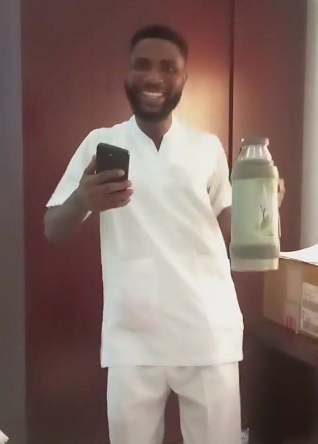 A man stands smiling in front of a closed brown wardrobe. He is wearing a white outfit with short sleeves and matching pants. He is holding a smartphone in one hand and a silver thermos with green accents in the other. The thermos appears full and slightly blurred due to movement. A cardboard box is visible on a shelf to his right. A white paper is stuck on the wardrobe. He appears to be posing and possibly recording a video.