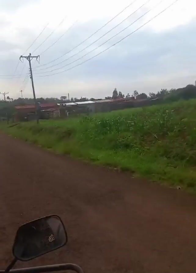The video is taken from a moving vehicle, possibly a motorcycle, traveling on a dirt road. The road is reddish-brown and slightly uneven. The weather appears overcast with a light grey sky. The surrounding landscape is predominantly green, with areas of tall grass and vegetation. To the side of the road, there are scattered buildings, some appearing to be modest dwellings. Power lines run overhead. Another motorcycle passes in the distance at one point. The overall impression is of a rural or semi-rural area.