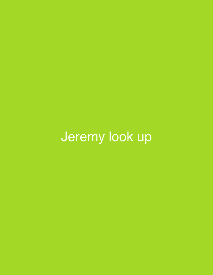A solid, vibrant chartreuse background occupies the entire frame. Centered horizontally and vertically, the phrase "Jeremy look up" appears in white, sans-serif font. The text is simple, direct, and serves as the focal point of the image. The color choice and text placement create a minimalist and straightforward visual statement.