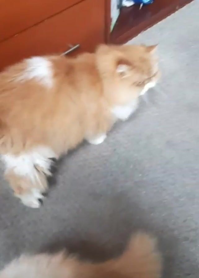 two fluffy cats on a grey carpet, with a wooden cabinet and a bookshelf in the background. The cat closest to the camera is mostly out of frame. The other cat is orange and white, and it sits looking to the side, then it looks up at the camera with a squint. A woman's voice is heard speaking in the background.
