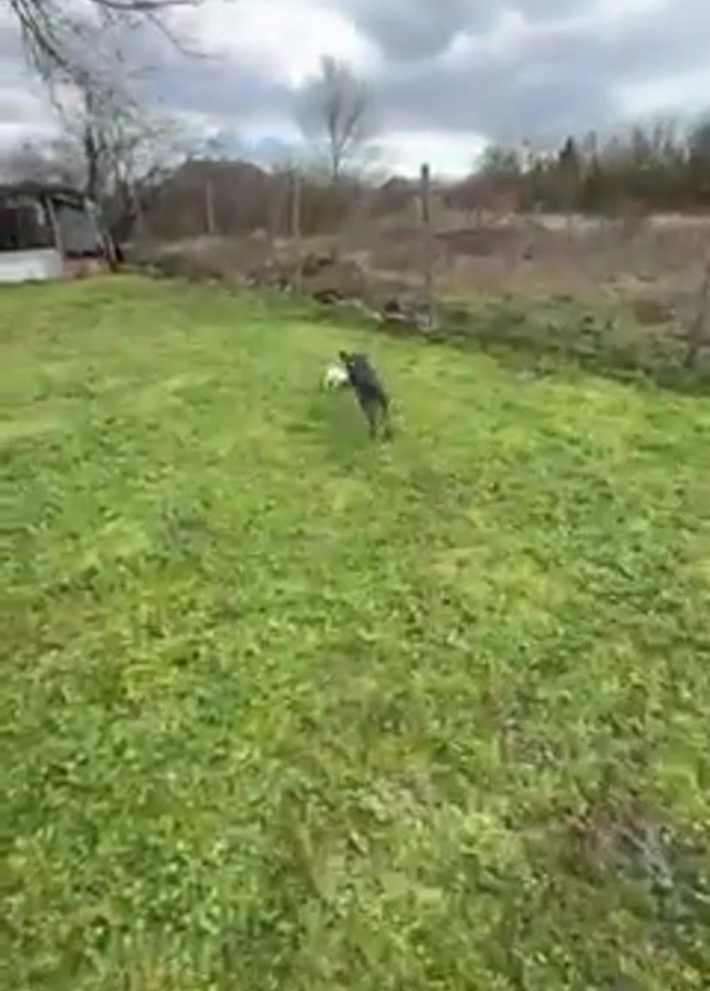 - "A gray pitbull puppy is running across a green lawn toward the camera, carrying a soccer ball" by FM-NMkt72, licensed under CC BY 4.0