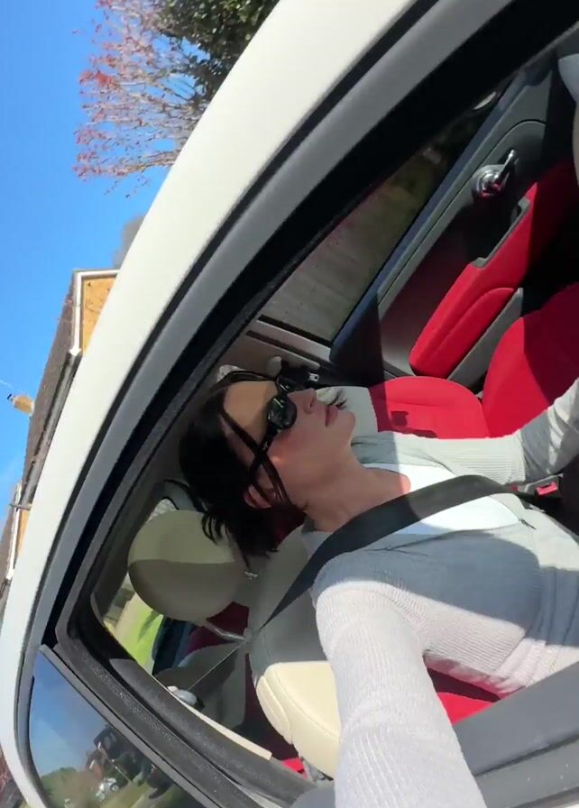 A woman in a white car, wearing sunglasses and a gray sweater, rests her head against the car door frame, looking up. The interior of the car has red seats and a white steering wheel. The car is parked, and a tree with white blossoms is visible against a blue sky. The camera angle shifts slightly, focusing more on the tree and then back to the woman in the car.
