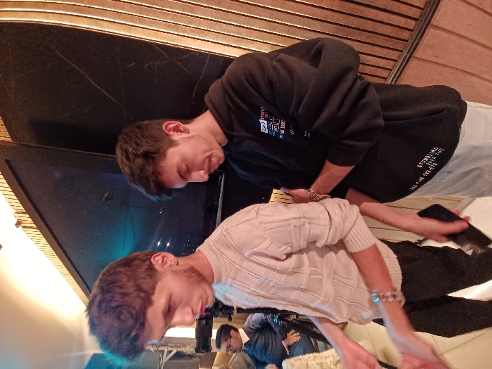 Two men stand together. The man on top wears a black hoodie and gray pants and has a watch on his left wrist. The man below wears a white knit shirt, black pants, and two bracelets on his left wrist. Both men hold black smartphones. They are indoors, with a black wall on the left and a wood-paneled wall above. In the background, a glimpse of other people can be seen.