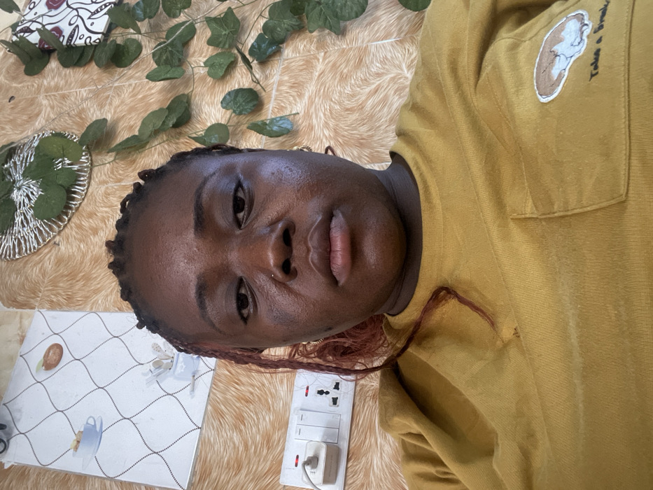 The image presents a close-up, chest-up view of an adult female centered in the frame, looking directly at the camera with a neutral expression. She has dark skin, braided hair with visible reddish-brown strands, and a small stud piercing on her left nostril. She is wearing a mustard yellow long-sleeved top that features a patch pocket on the left side of the chest, embroidered with a sleeping animal (possibly a dog or cat) and the text "Take a Break." The background consists of a wall covered in a light brown, textured material resembling fur or a fluffy fabric. Various decorative elements adorn the wall: In the upper left quadrant, a white rectangular panel with a pattern of intersecting diagonal lines and illustrations of teacups and a single seed/bean is visible. In the upper right, a circular metallic mesh decoration is partially visible, interwoven with artificial green leaves. Below this, a long strand of artificial green ivy-like leaves hangs vertically down the wall. In the lower left quadrant, a white electrical outlet plate is mounted on the wall, featuring multiple switches and three-pin sockets, one of which has a white plug inserted. Red indicator lights are visible on some of the switches. The specific location within the city of Abuja, Federal Capital Territory, Nigeria, cannot be determined from the visual information provided in the image.