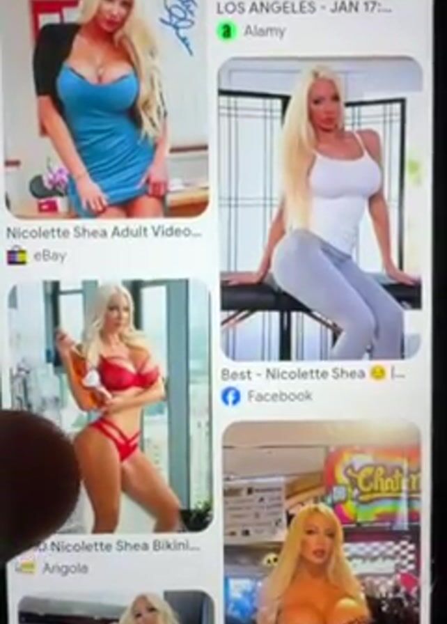 A person is scrolling through a series of images on a phone. The images show a blonde woman in various outfits, some revealing. The search query at the top of the screen indicates the woman's name is Nicolette Shea. The images are from various sources, including eBay, Facebook, and Alamy.