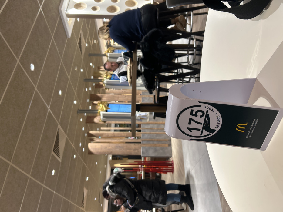 McDonald's restaurant interior, with a table tent in the foreground. The tent is white with a black panel displaying the number "175" inside a circle, accompanied by the text "SERVICE A TABLE" and a hand holding a table tent icon. The McDonald's logo is visible below. The French text "Merci de placer votre chevalet sur la table" is also printed on the panel. In the background, people are seated at tables, and the interior design includes wooden elements and tiled floors.