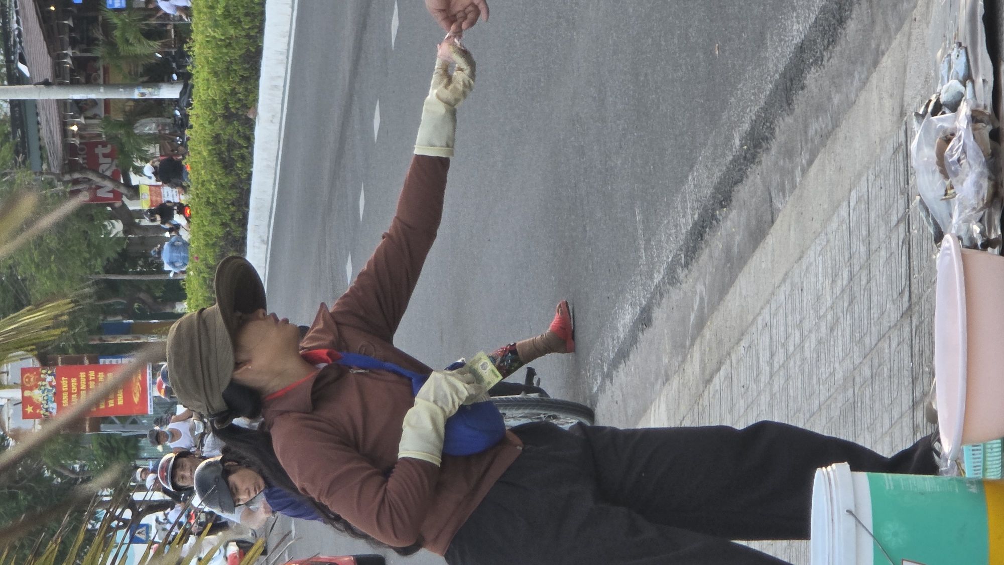 In Nha Trang, Vietnam, a person wearing black pants, a brown jacket, and a khaki-colored hat sits on a bicycle near the curb of a street. They are wearing gloves and holding up a hand, seemingly to receive something from an unseen person whose hand is visible above. The person sitting on the bicycle also has a blue bag and is wearing red shoes and patterned tights. The street is lined with a sidewalk made of paving stones, and a white stripe marks the edge of the road. In the background, there is a street with motorbikes and pedestrians, along with buildings and trees. A bucket is near the curb, and there is some trash on the curb as well.