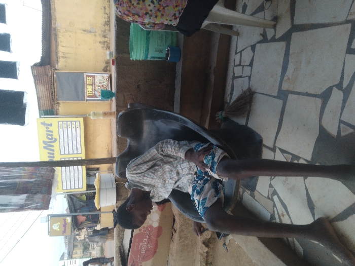 The scene is an outdoor commercial area within Agege, Nigeria, characterized by a tiled ground surface and visible shopfronts under an overcast sky. In the foreground, a young male individual with a slender build and dark skin sits slumped forward in a dark, possibly plastic, ergonomic-style chair. He wears a light-colored, short-sleeved plaid shirt and patterned shorts, with bare feet resting on the tiled ground. His head is lowered, directed towards his lap or the ground immediately in front of him. A small broom with natural bristles lies on the tiled ground next to his chair. To the right, a partial view of another person in a floral-patterned top is visible, seated in a white plastic chair. Behind these individuals, a raised concrete ledge or platform extends horizontally. On this platform, from left to right, are a white plastic bucket, a tall yellow plastic bottle with a dispenser, a teal-colored cup, a green plastic bucket, and a smaller blue container. In the mid-ground, a prominent yellow sign bearing "YouMart" in black lettering is displayed, featuring a price list for items such as "Milo N200," "Peak N200," "Milk N150," and "Chocodrink N200." Below and to the right of this, a smaller sign advertises "TEMI TEE" along with "SAUSAGE ROLLS & TEA." Behind these signs stands a light-colored building with a section of corrugated metal roofing. Overhead, multiple pieces of dark fabric or clothing hang from suspended lines. In the distant background, other buildings are partially visible beneath overhead utility lines.