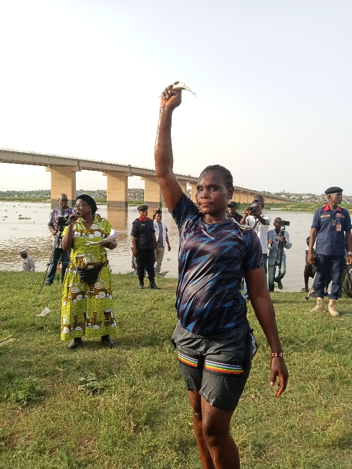 woman standing in a field of grass near a river in Jimeta, Nigeria, at the coordinates 9.287 latitude and 12.465 longitude. She is holding a small fish in her right hand and her left hand is at her side. She is wearing a blue shirt and black shorts with a rainbow colored stripe on each side. A woman is standing behind her, holding a microphone and speaking to the camera. She is wearing a green and brown patterned dress. There are several other people in the background, including a man in a uniform and a woman in a white shirt. There is a bridge in the background spanning a river. The river is on the left of the image. The grass is green. The sky is a light blue. The scene appears to be an event or a gathering of people. The woman with the fish is likely the subject of the gathering.