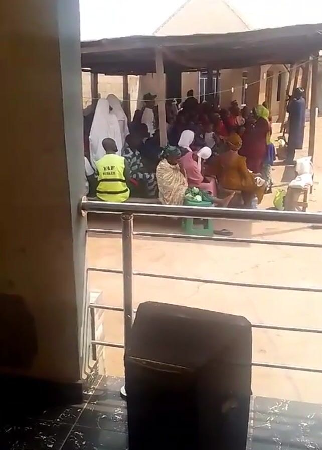 group of people gathered outdoors under a covered area. They are seated on chairs and mats. Some people are wearing traditional clothing. One person is wearing a yellow vest with the letters "YAF" on it. A black speaker is in the foreground. The view is from inside a building looking out onto the gathering. The building has a tiled floor and a metal railing. The weather appears sunny.