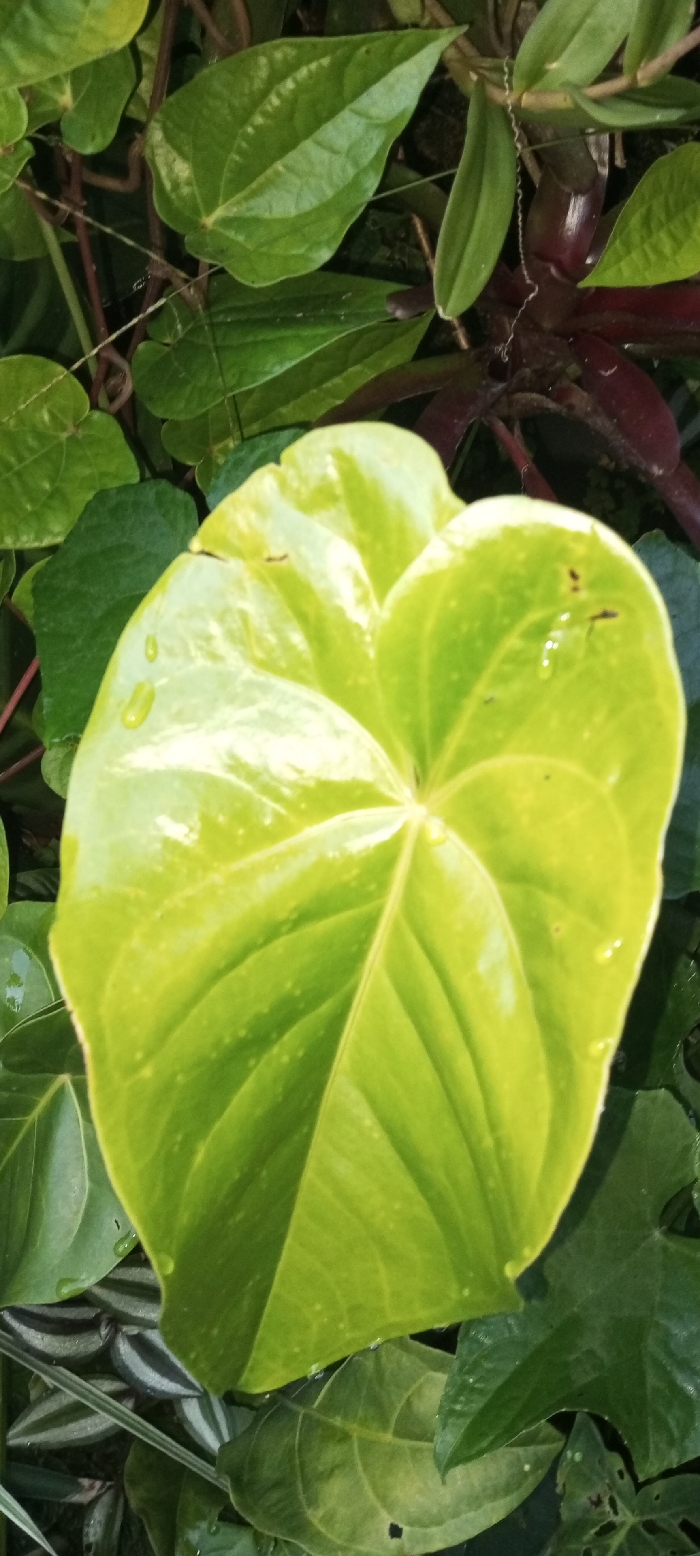 A lush green scene features a large, glossy, heart-shaped leaf as a focal point. The leaf displays vibrant shades of green with lighter yellow-green areas and visible veins. Surrounding it are diverse foliage, including smaller, darker green leaves with rounded shapes and some vine-like plants with reddish stems. Water droplets are visible on some leaves, enhancing the natural, fresh ambiance of the setting.