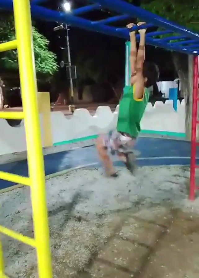 - "A boy in a green sleeveless shirt and patterned shorts swings across a blue monkey bar set" by FM-ymGPj1, licensed under CC BY 4.0