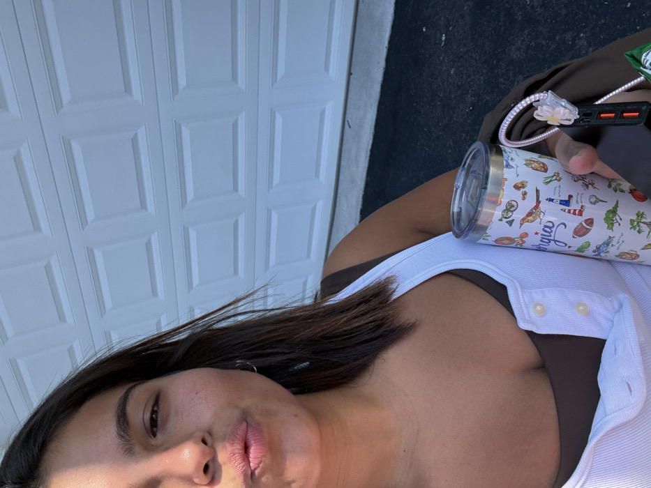 The image depicts a close-up, eye-level perspective of a female individual captured outdoors in bright daylight. The subject, positioned to the left of the frame, has dark hair and light brown skin. Her lips are pursed in a "kissy face" expression, and she wears a small hoop earring in her visible left ear. She is dressed in a white ribbed tank top with a button placket, worn over a dark brown undergarment. In her right hand, she holds two primary objects: a white insulated travel tumbler with a clear lid and a dark rectangular object, possibly a smartphone or power bank. The tumbler is decorated with colorful illustrations, including birds, a lighthouse, a golf flagstick, a football, and palm trees. The word "Georgia" is prominently displayed in blue cursive text on the tumbler. A white coiled cable with a small, clear or white floral-shaped charm is attached to the rectangular device. The background consists of a white paneled garage door, which occupies the upper right portion of the image. Below the garage door, a concrete strip and dark asphalt pavement are visible. The exact location within the city of Princeton, United States, is not discernible from the visual information provided in the image.
