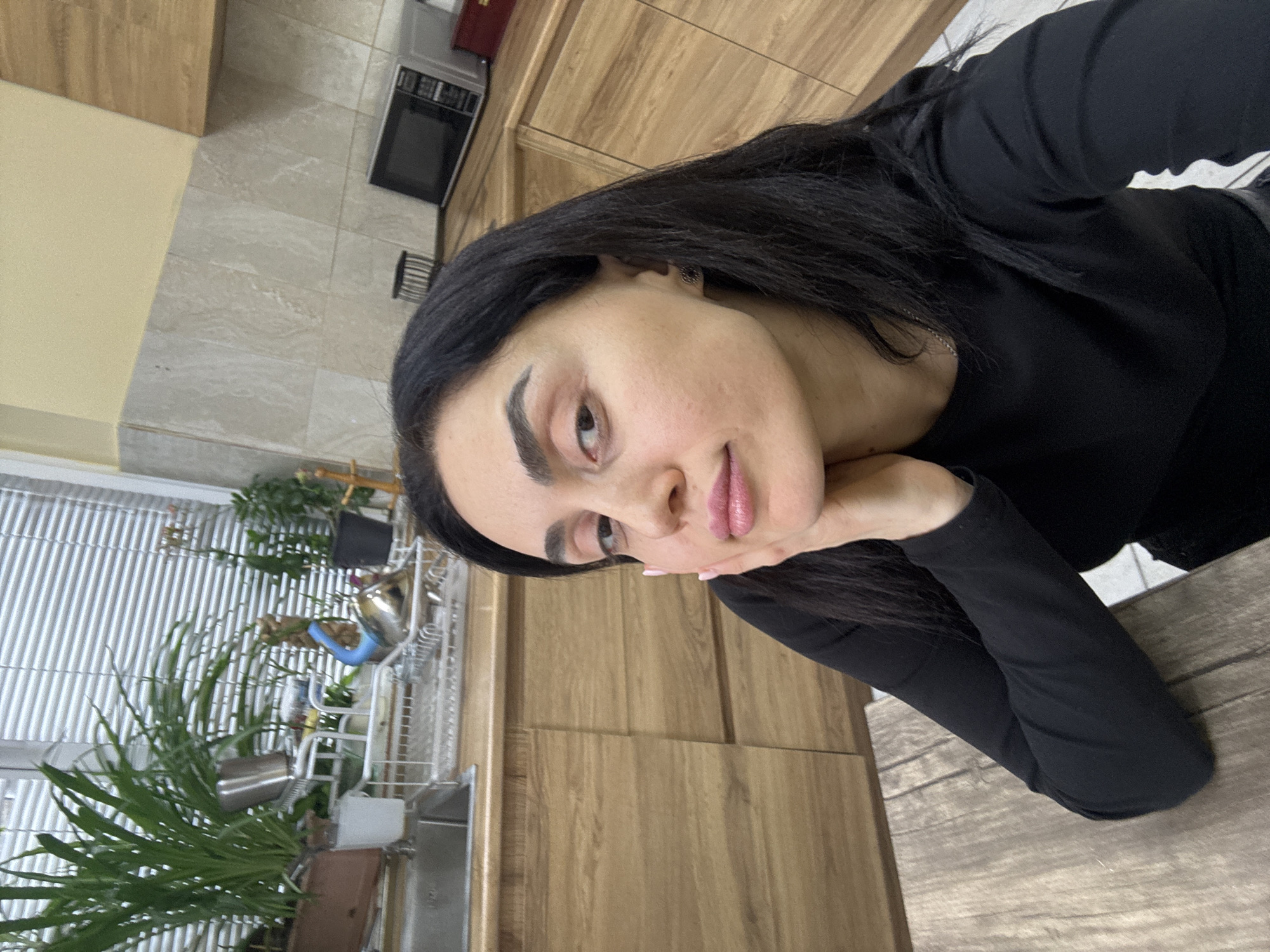 A medium shot shows a woman with long, dark hair resting her chin on her hand. She wears a black long-sleeved shirt. The background suggests a kitchen interior with wooden cabinets, a sink area with a drying rack holding dishes, and plants visible near a window. A microwave is mounted above the counter. The location is identifiable only as an interior space, with no external landmarks to confirm a specific location like Tbilisi, Georgia.