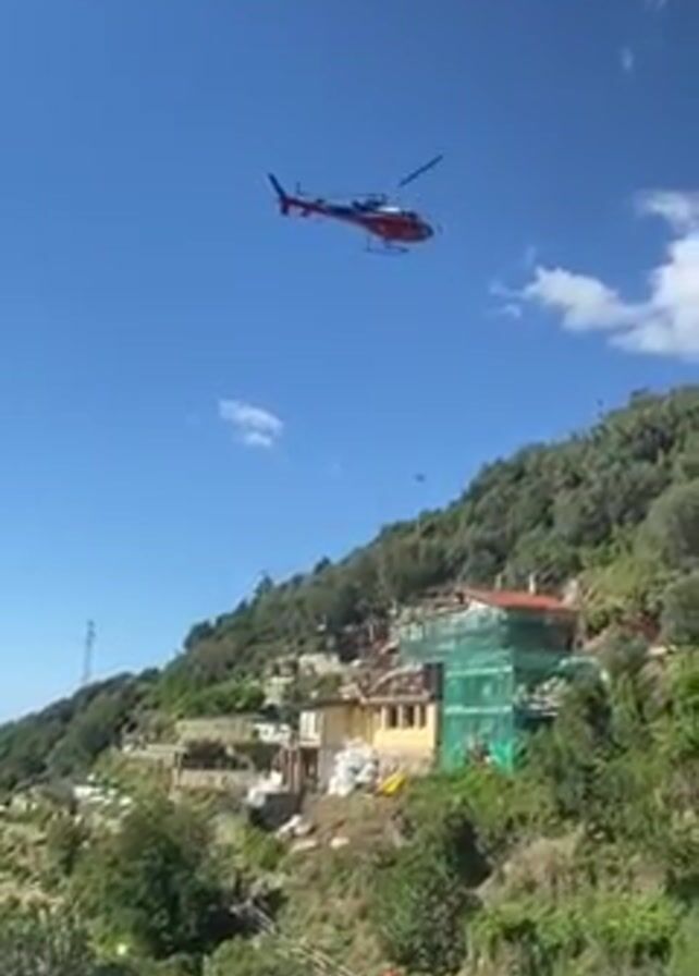 A red and white helicopter carrying a load on a cable flies over buildings on a hillside. The hillside is covered in trees and houses in various stages of construction and repair. A building is covered in green netting. The sky is bright blue with a few scattered clouds. A power line runs along the hillside. The sound of the helicopter is audible.