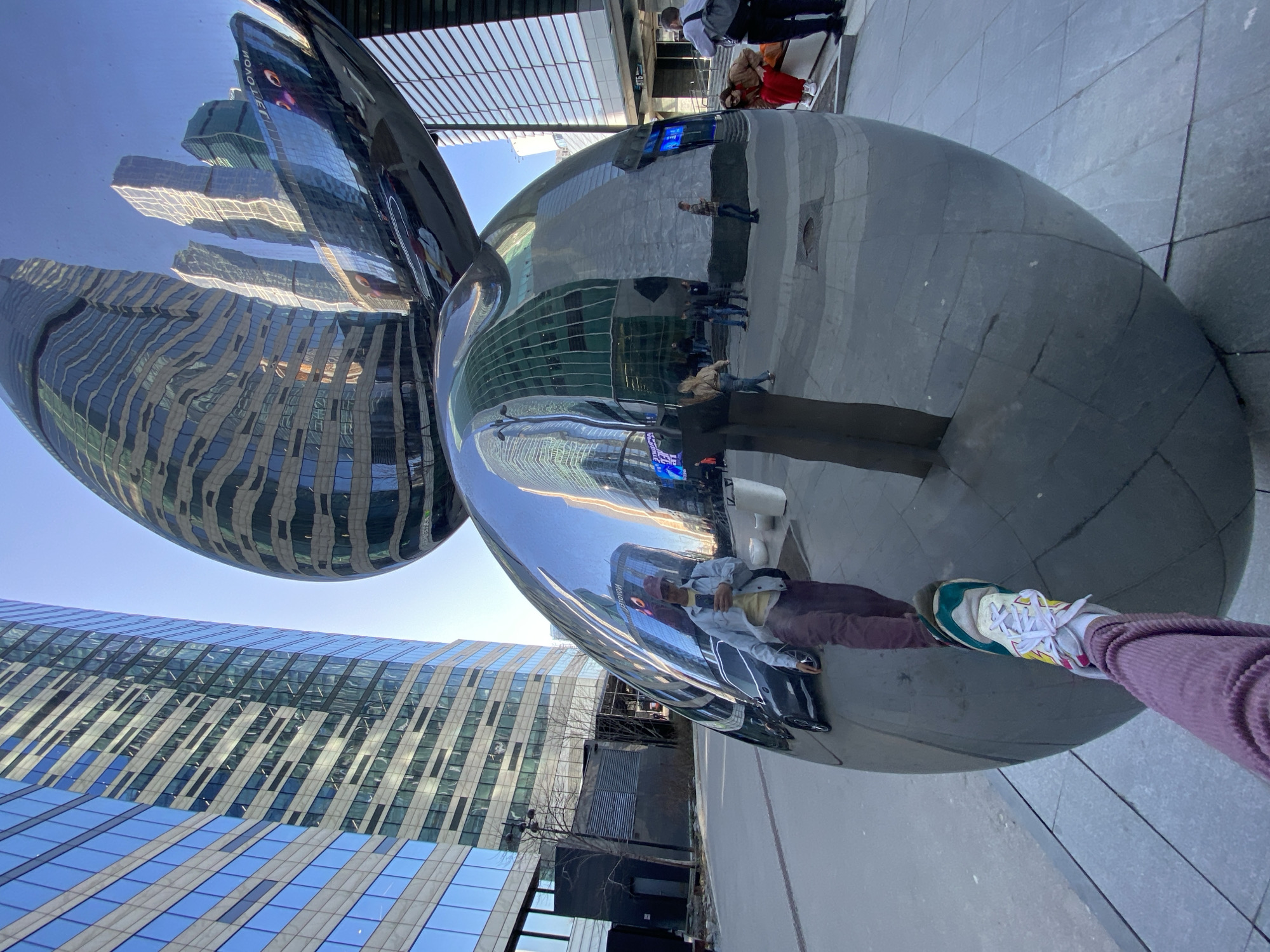 large, shiny, chrome-like sculpture in an urban setting. The sculpture reflects surrounding skyscrapers and people walking by. The photographer's leg, clad in purple corduroy pants and a colorful sneaker, is visible at the bottom of the image. The location is likely Khimki, Russia, as indicated by the prompt. The architecture includes modern, glass-faced buildings. The sky appears clear.