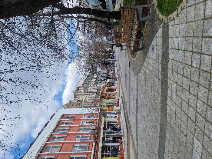 The image captures a pedestrian street in Svilengrad, Bulgaria, under a partially cloudy sky during daylight hours